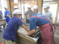和紙の里では、和紙作りの工程について職員の方から話をしていただいた後、実際に和紙作りの体験を行いました。和紙作りでは、最初職員の方が横に付いてくださり一緒に行いましたが、後半は一人で作業を行いました。