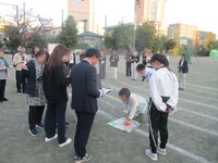 体育の時間走を行っている最中に、ある児童が倒れてしまったという想定で、訓練を行いました。担任役、児童役、現場へ駆けつける教員役に分かれて実施し、一時救命措置を続けながら、救急車の要請やAEDの手配、保護者への連絡等、同時進行で行う訓練でした。