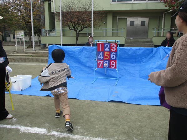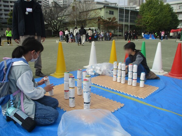 校庭では、野球のストラックアウトやサッカーのキックターゲット、バスケットボールのフリースローなど体を動かすパビリオンや、コマやけん玉、竹とんぼなどの昔遊び、缶バッチづくり、空き缶積みなど、工夫を凝らしたパビリオンがたくさん出ていました。