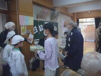 会議室にお集りいただいた後、各学年の代表児童がお迎えに上がり、教室までご案内をいたしました。教室では、児童と地域の方で一緒に給食を食べ、懇親を深め、感謝の思いを伝えることができました。