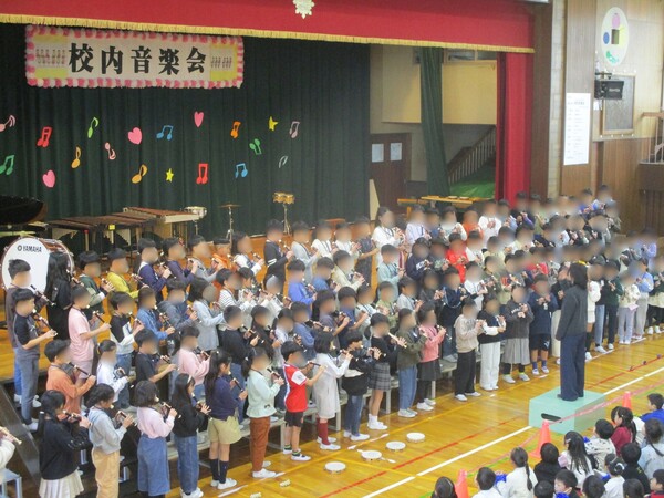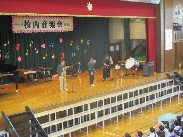 3・4時間目を使い、全校児童が体育館に集まり、お互いの演奏を聴き合いました。インフルエンザや風邪様症状等で開催が心配された音楽会ですが、無事に行うことができました。