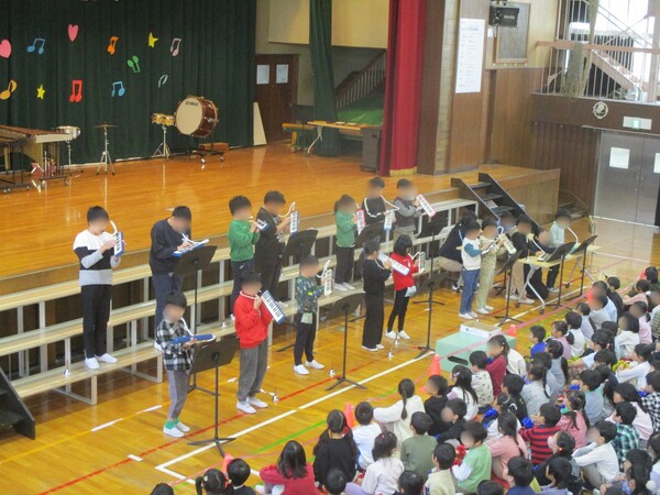 その後は、1年生からの発表となりました。1年生➡2年生➡なかよし➡3年生➡4年生➡5年生➡6年生と、学年が上がっていくに連れ、曲の難易度も高くなり、自分たちの発表を終えた学年も夢中で演奏に聴き入っていました。