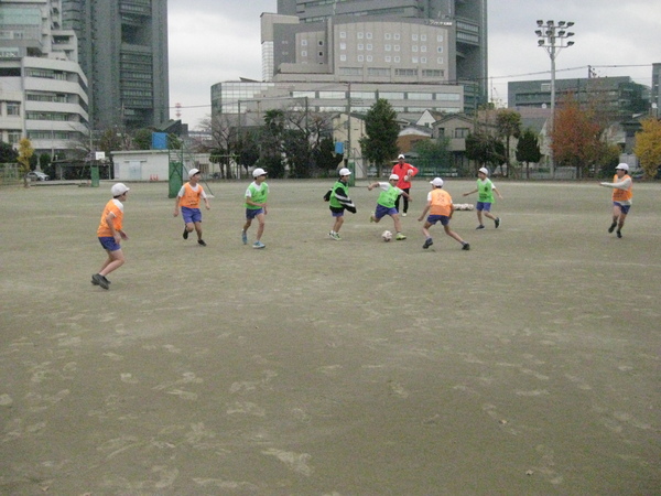 その後、2クラスごとに校庭に出てサッカーをしました。子どもたちは相手への「思いやり」を大切にしながら、仲間を励ましたり、パスをしたりしました。サッカーが得意でない子や、最初は乗り気でなかった子も、サッカーを全力で楽しんでいる様子が見られました。何より全力で応援するとチームも相手もお互い気持ちがいいことを体感しました。