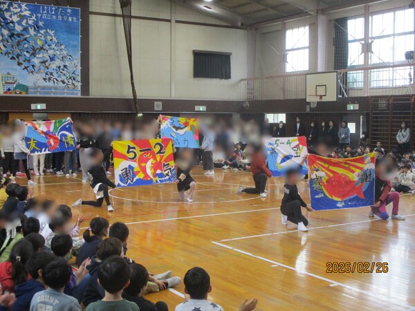 5年生は、『キセキ』の歌を6年生に向けた形で歌い、運動会で使った大漁旗で未来への応援の気持ちを届けました。