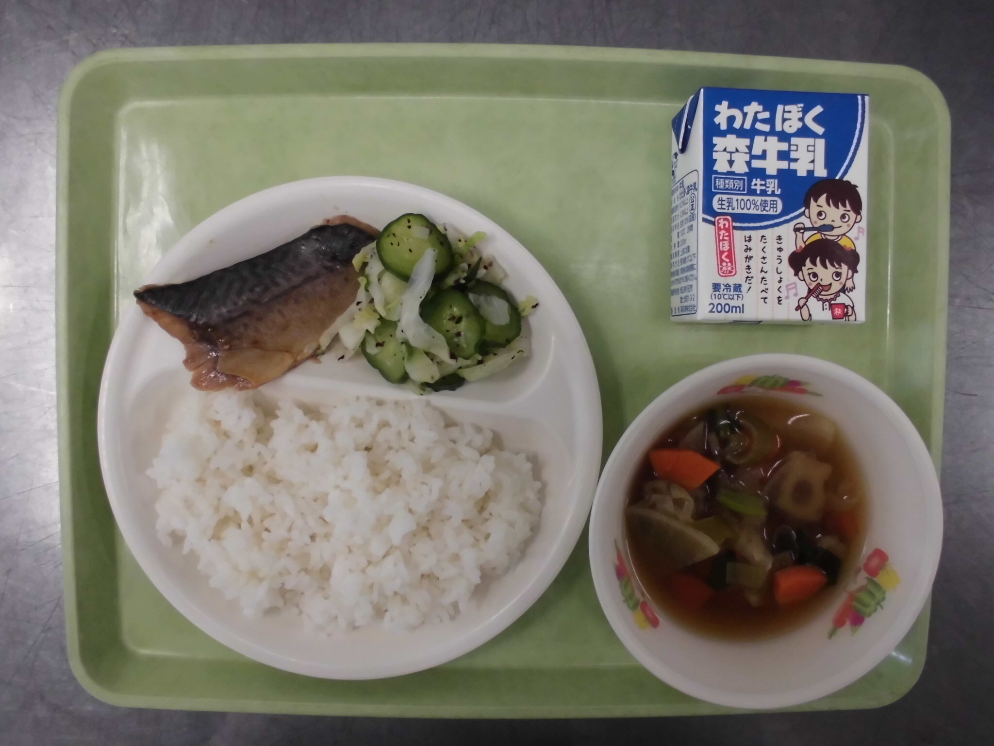 ごはん さばのゆうあんやき ゆかりあえ こんさいじる ぎゅうにゅう |