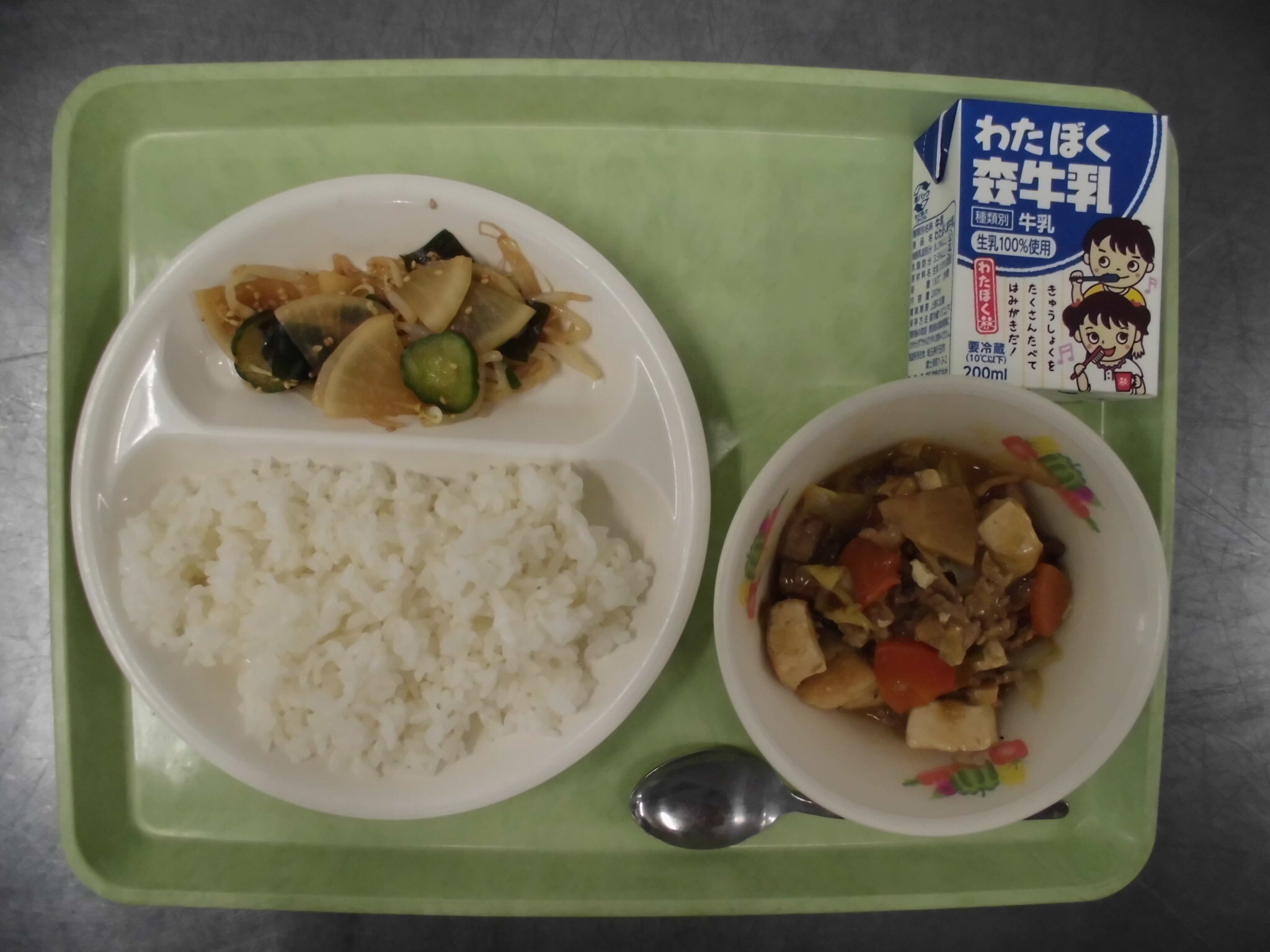 ごはん ジャージャーとうふ ちゅうかあえ ぎゅうにゅう |