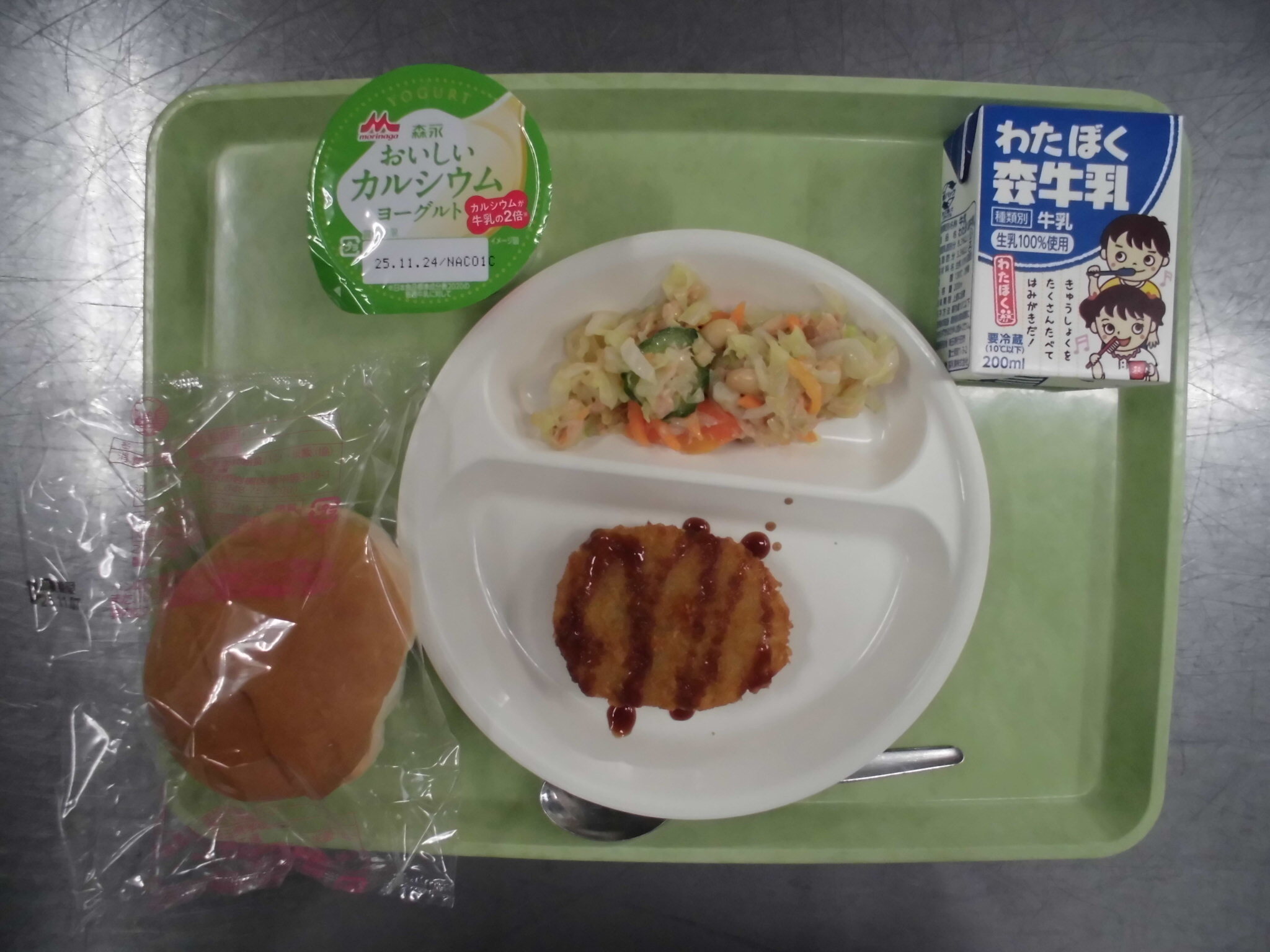 こどもパン メンチカツ だいずとツナのサラダ ヨーグルト ぎゅうにゅう |