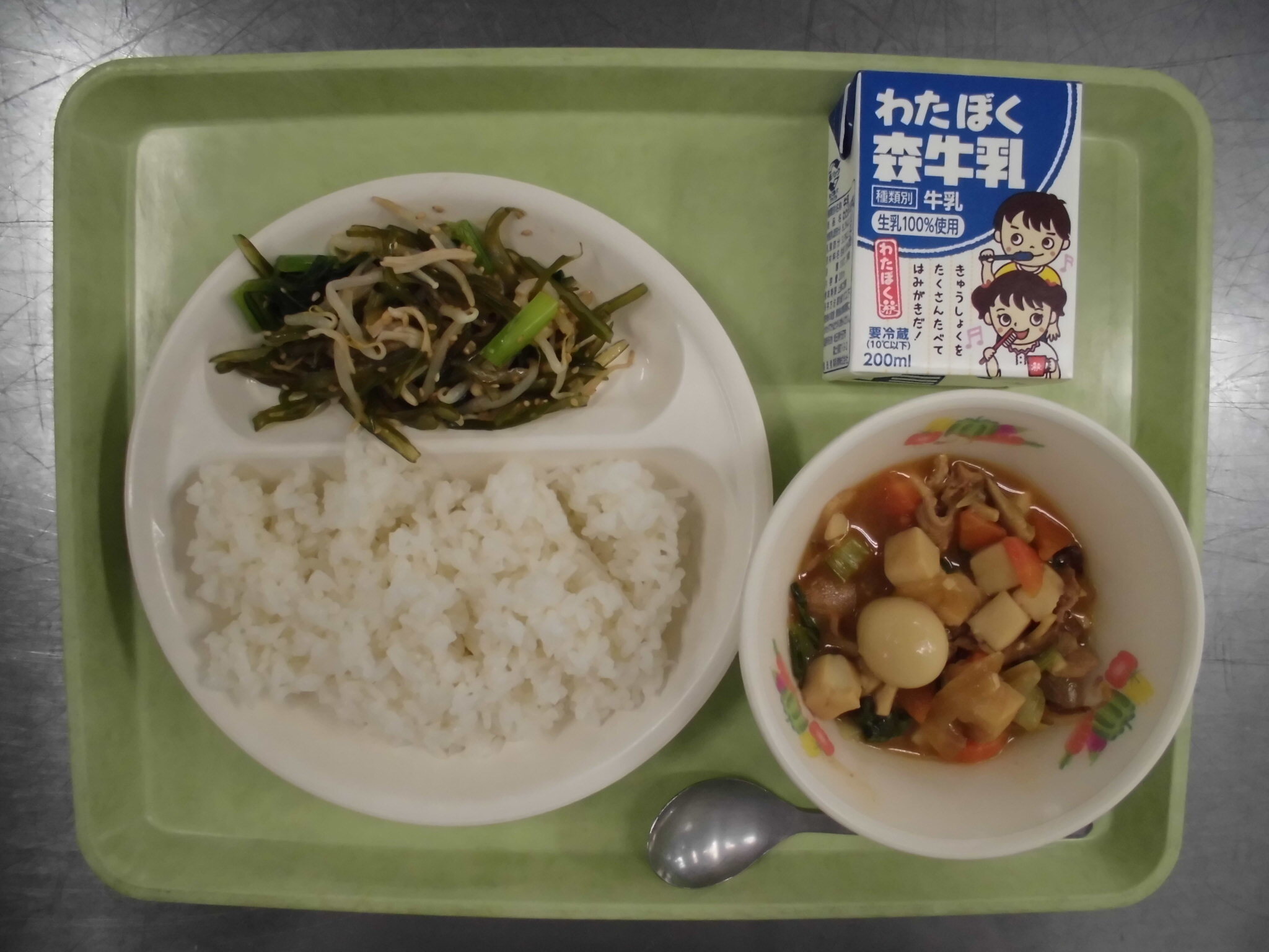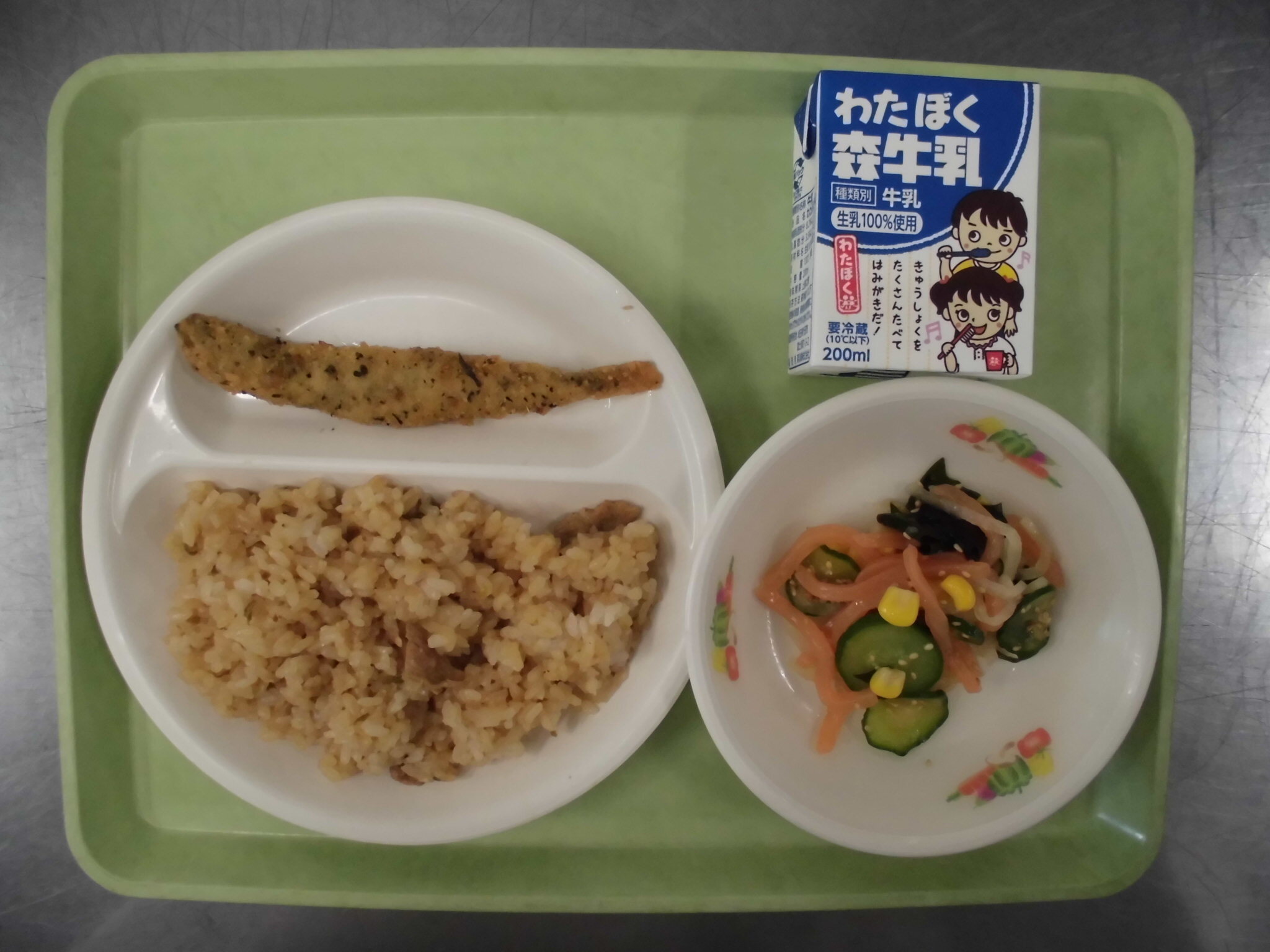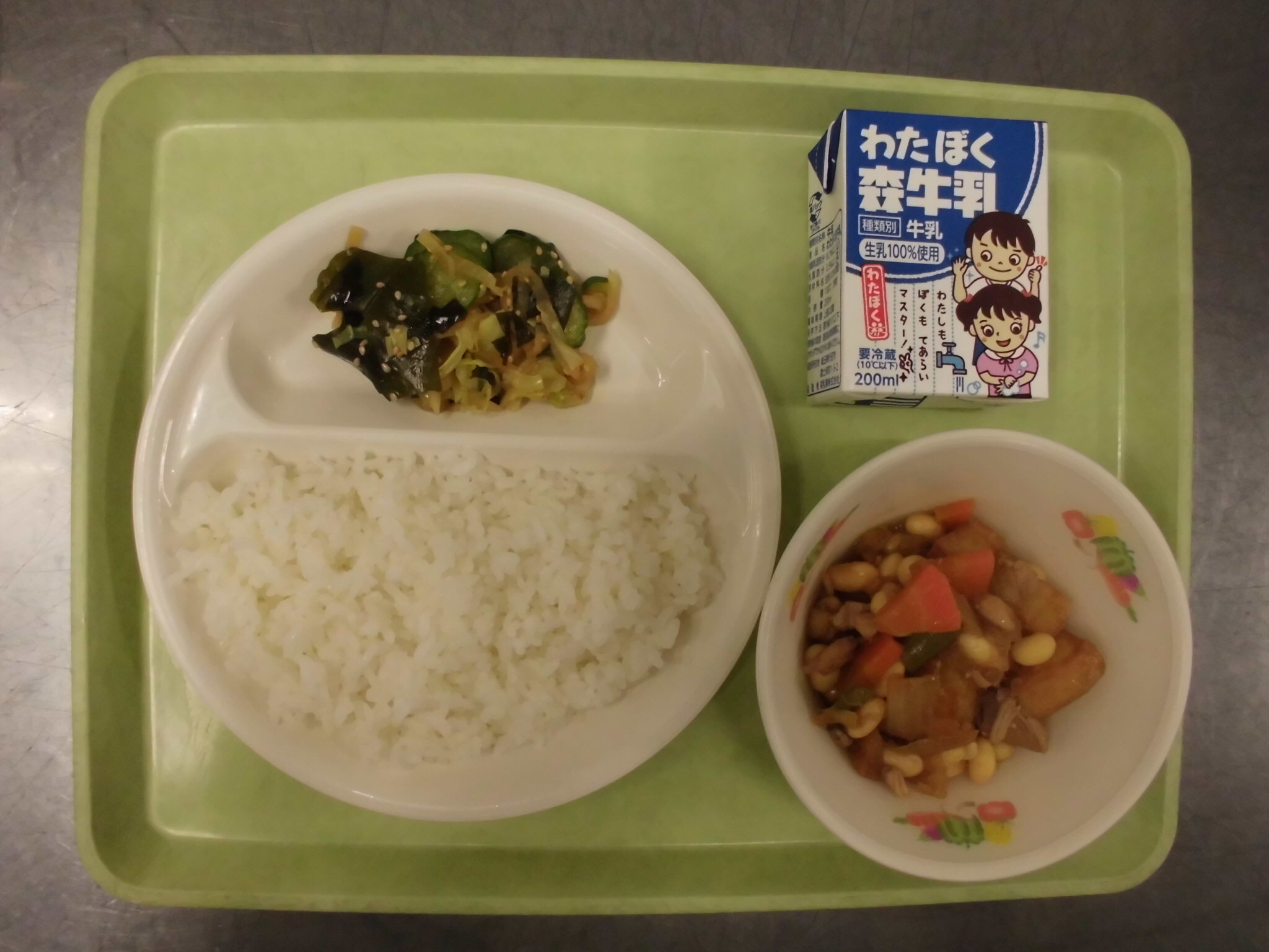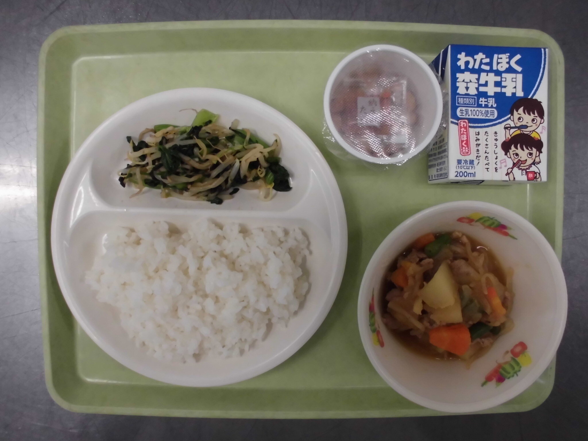 ごはん さいのくになっとう にくじゃが いそかあえ ぎゅうにゅう |