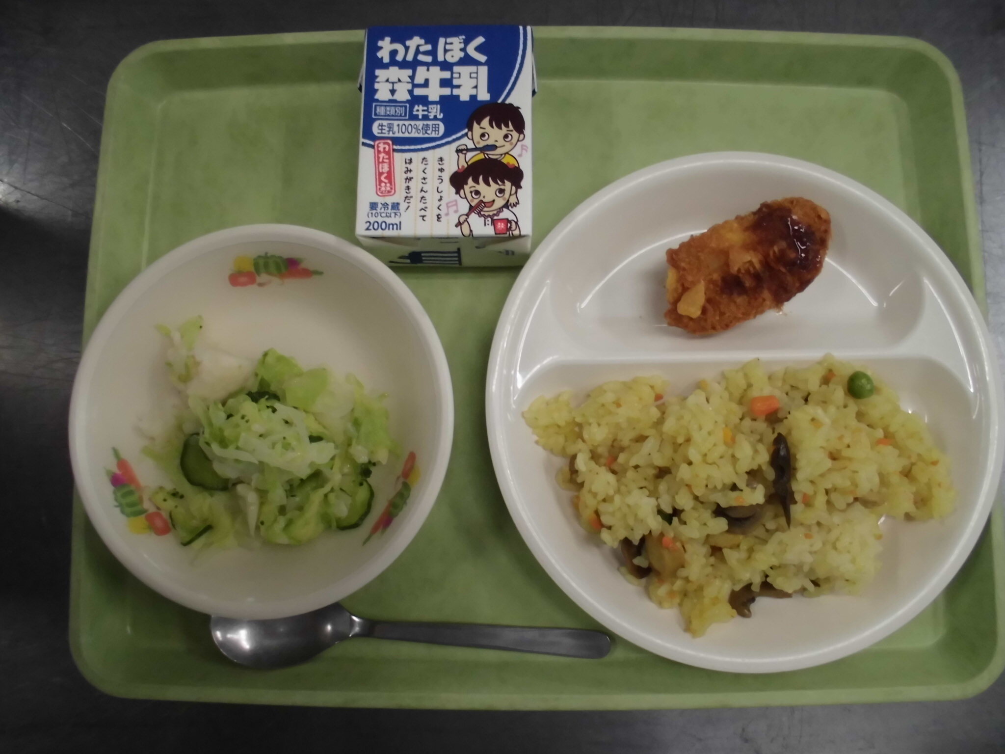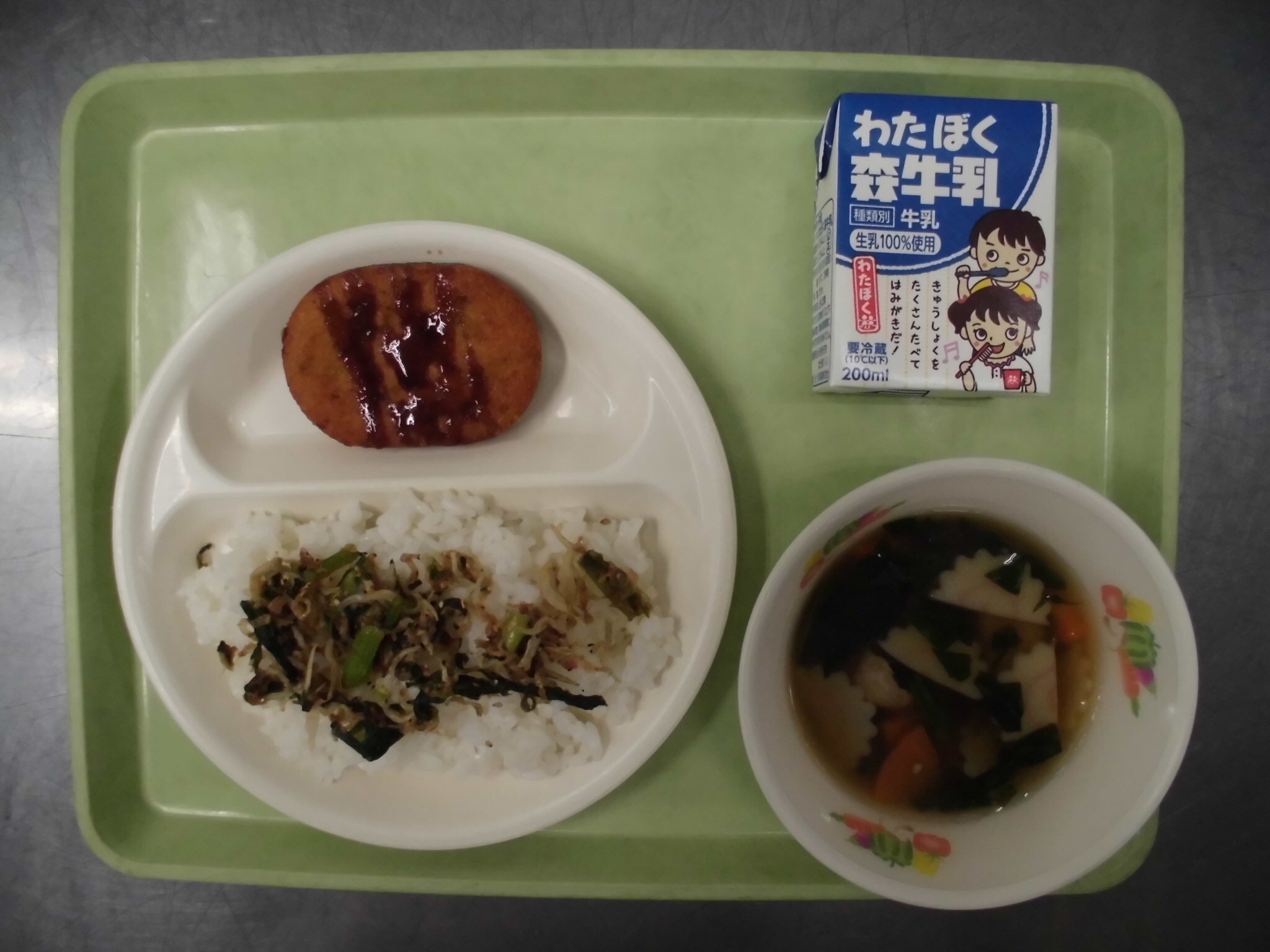 産 物 ごはん こまつなふりかけ ゼリーフライ まゆたまじる ぎゅうにゅう |
