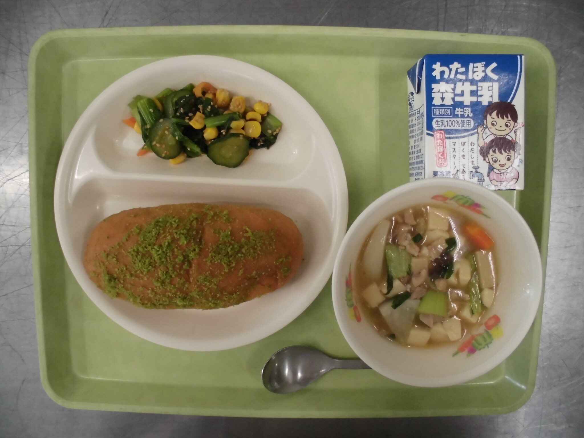 強 化 まちゃあげパン とうふのスープに こまつなとコーンサラダ ぎゅうにゅう