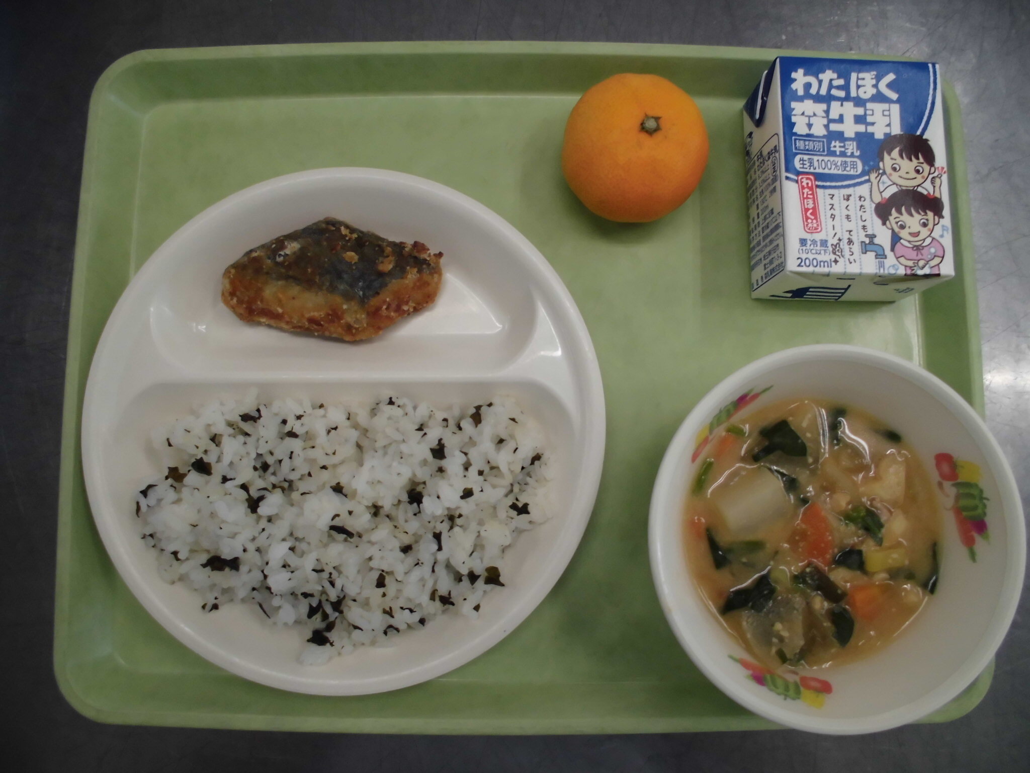 ウ ィ ー ク わかめごはん さわらのたつたあげ ごじる みかん ぎゅうにゅう |