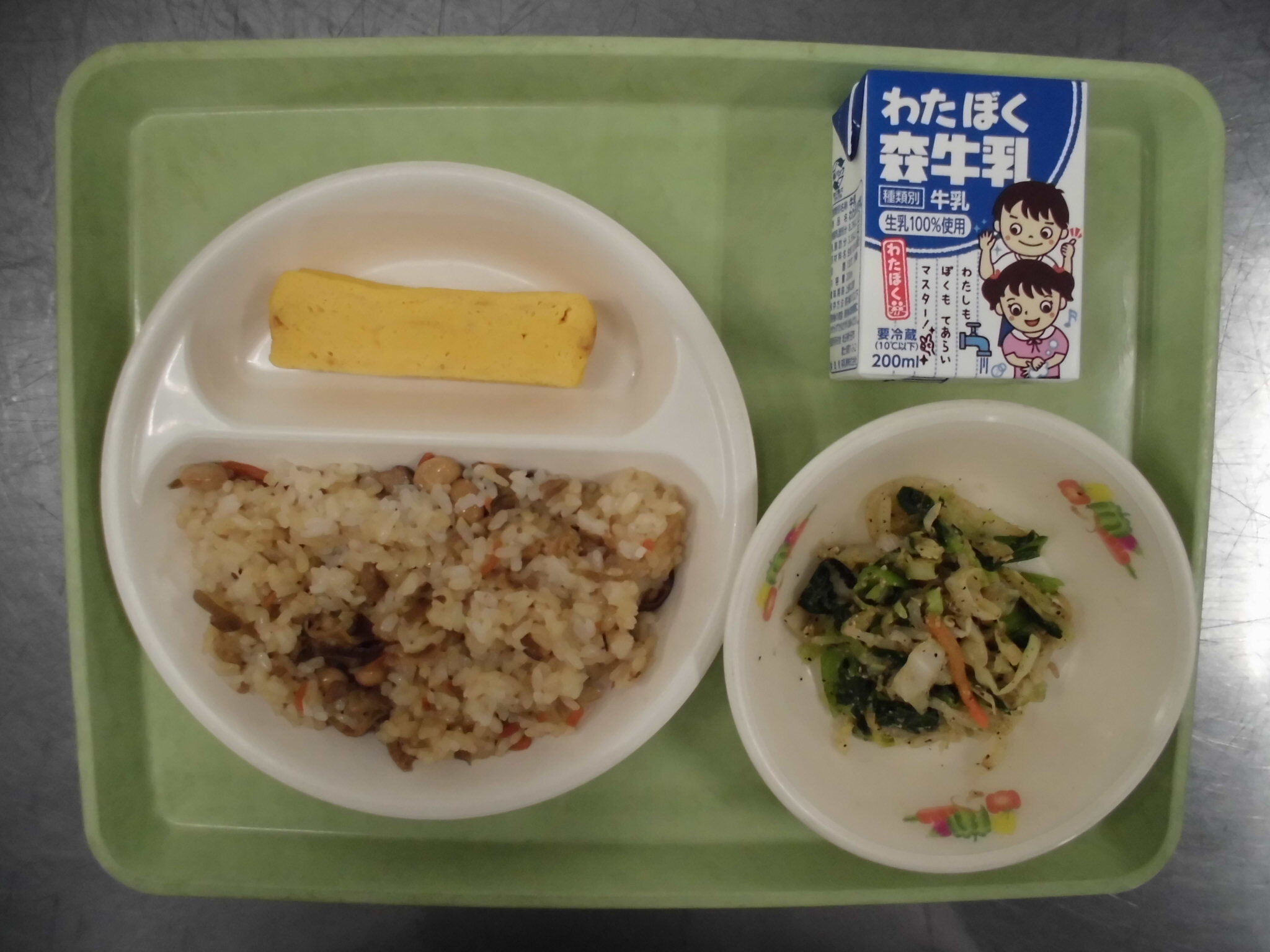 ごもくまめごはん だしまきたまご にしょくごまあえ ぎゅうにゅう