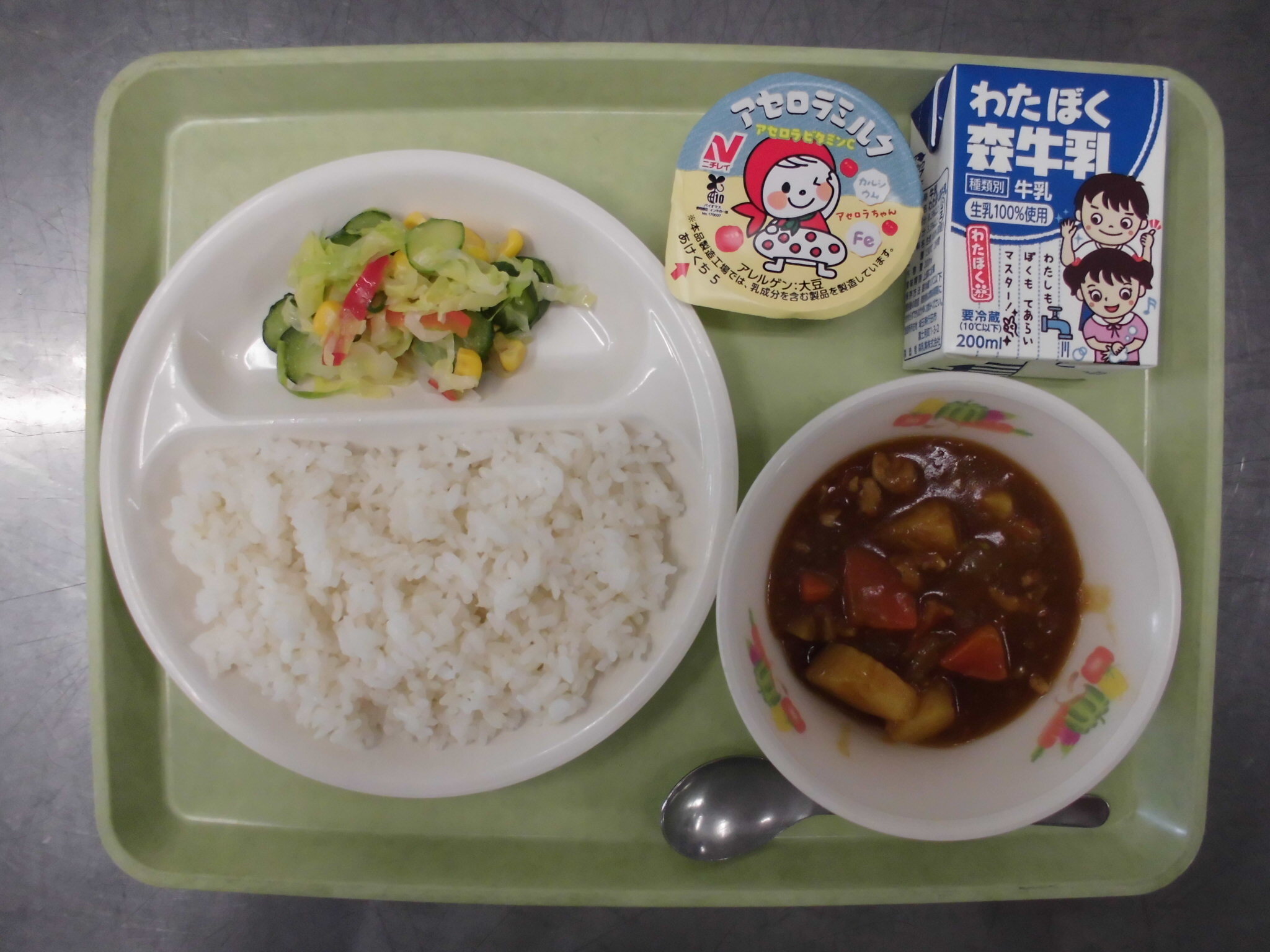 祝 開校記念日 こえどカレー(ごはん) コールスローサラダ こうはくアセロラゼリー ミルクゼリー ぎゅうにゅう |