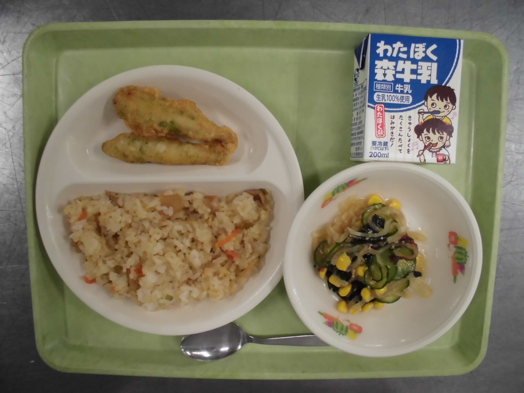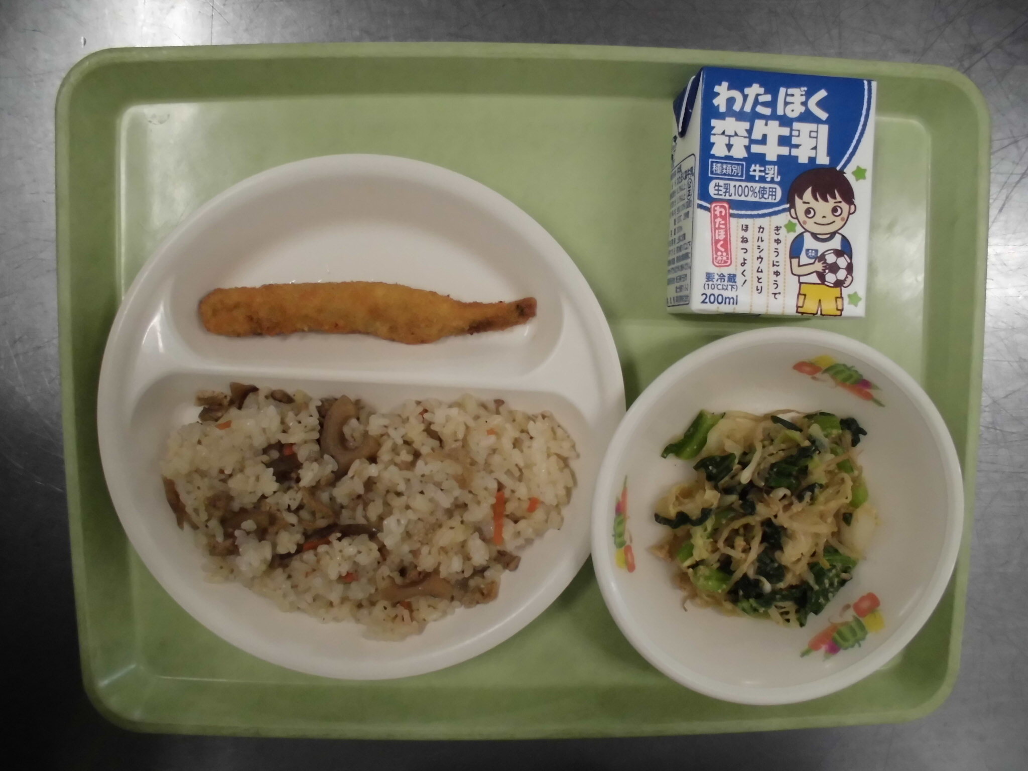 れんこんごはん ししゃもフライ ごまあえ ぎゅうにゅう |