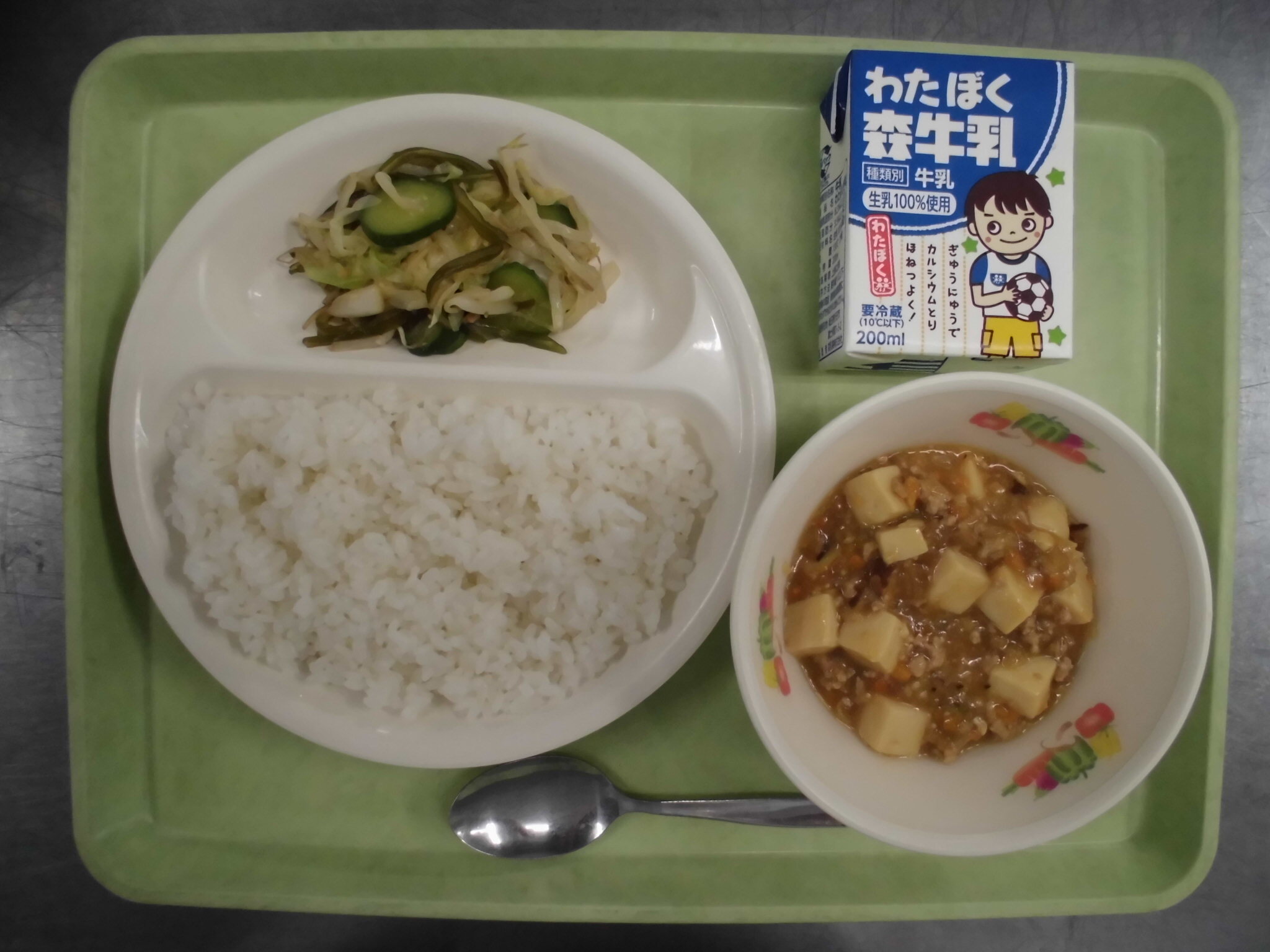 ごはん マーボーどうふ くきわかめのピリからあえ ぎゅうにゅう |