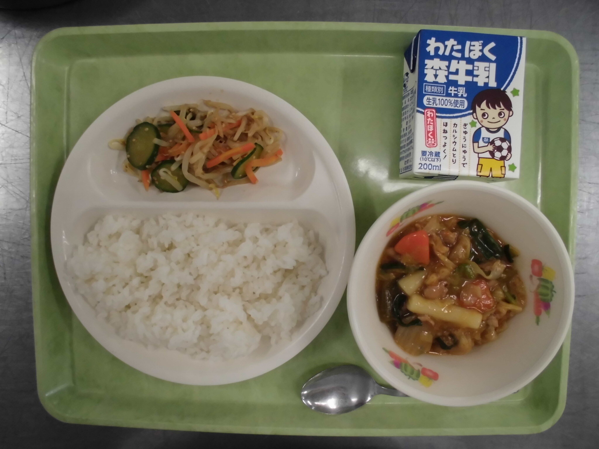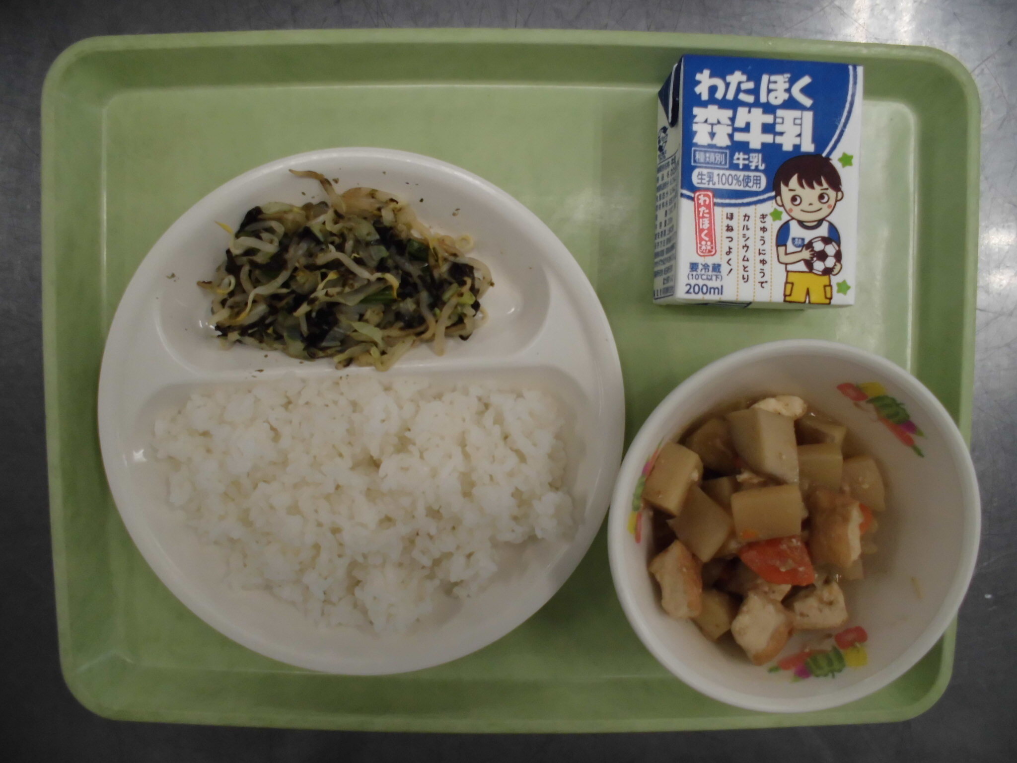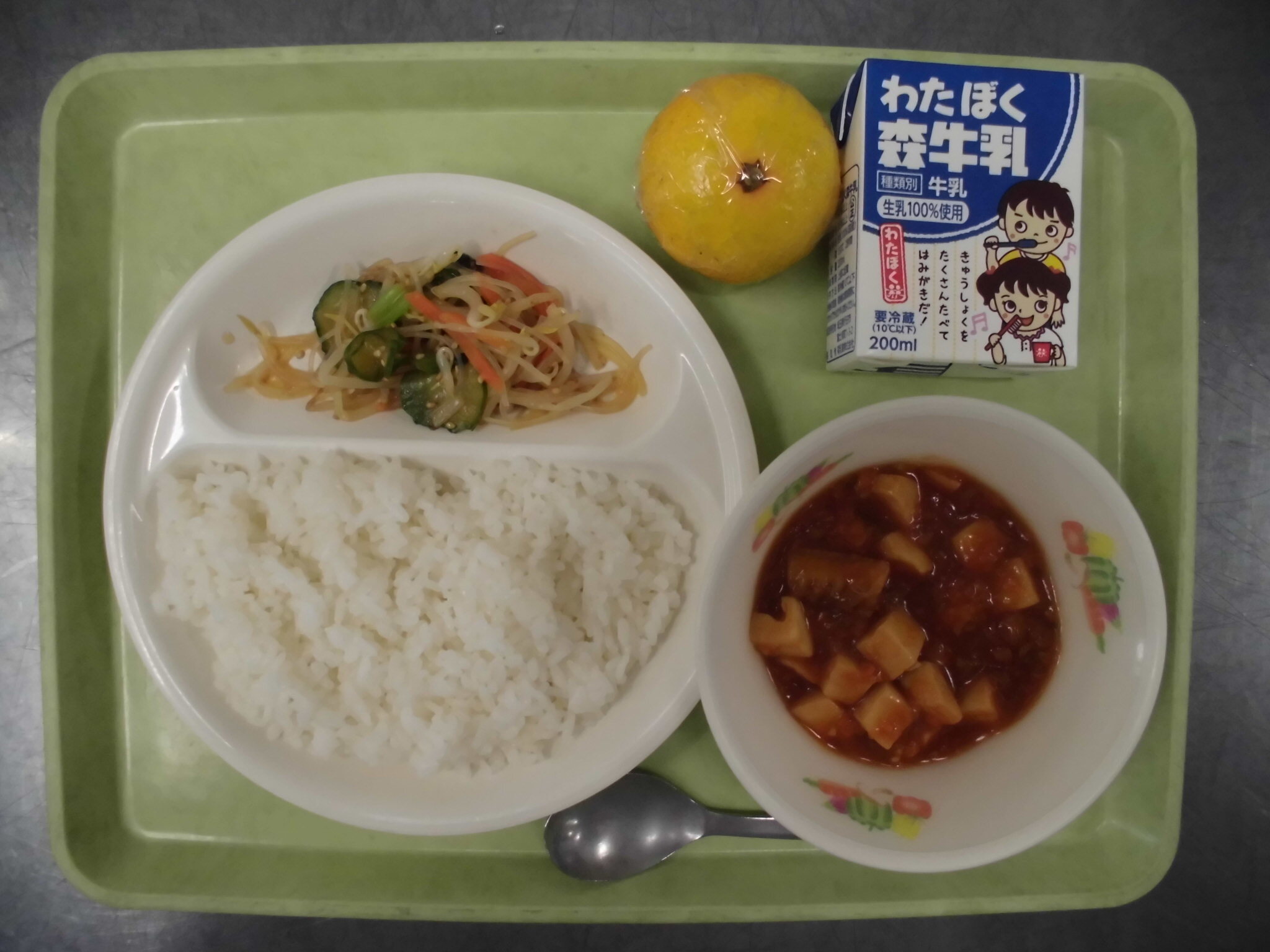 ごはん いかととうふのチリソース はるさめサラダ みかん ぎゅうにゅう |