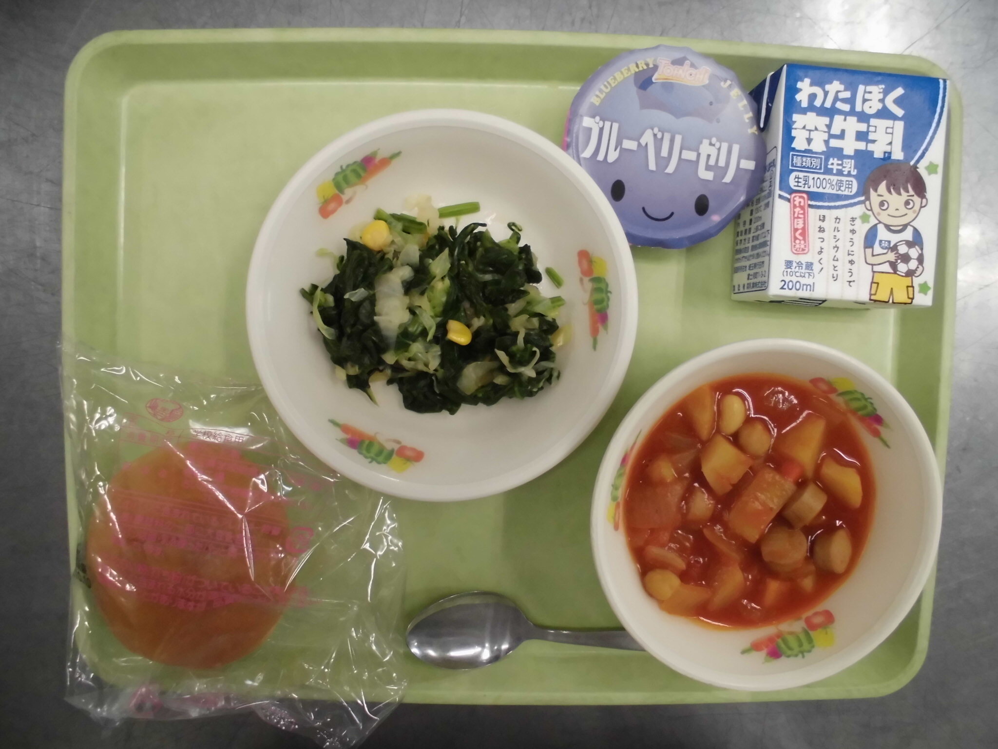 目の愛護デーこんだて はちみつパン まめとソーセージのトマトに ほうれんそうのサラダ ブルーベリーゼリー ぎゅうにゅう |