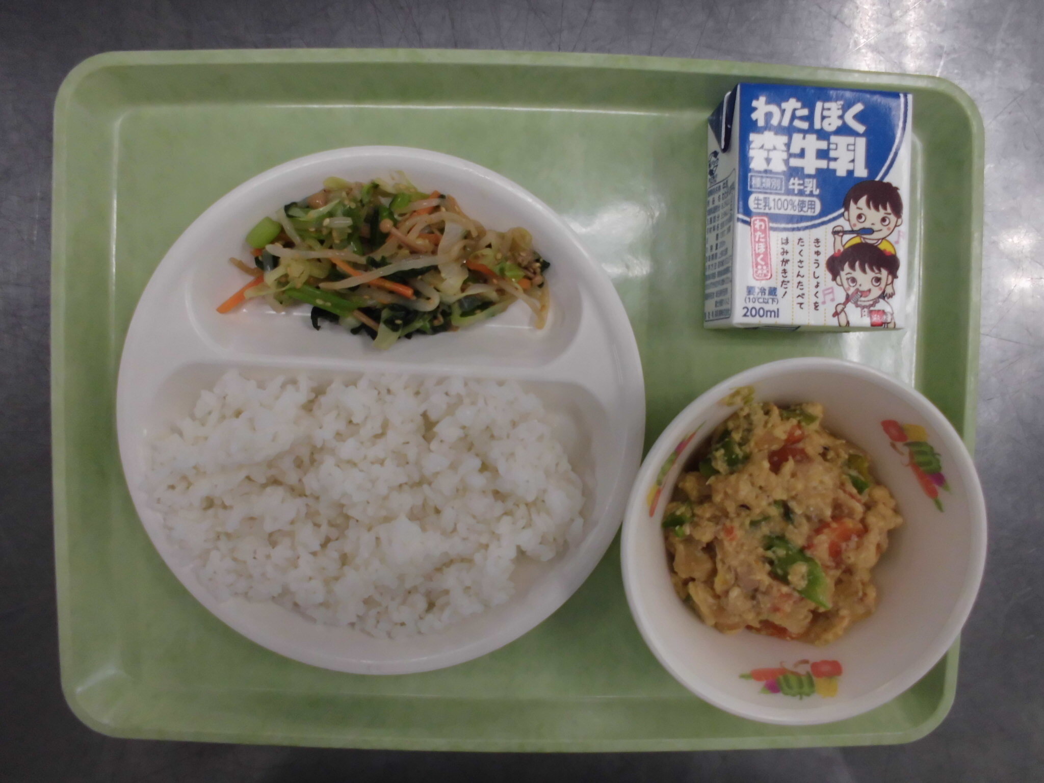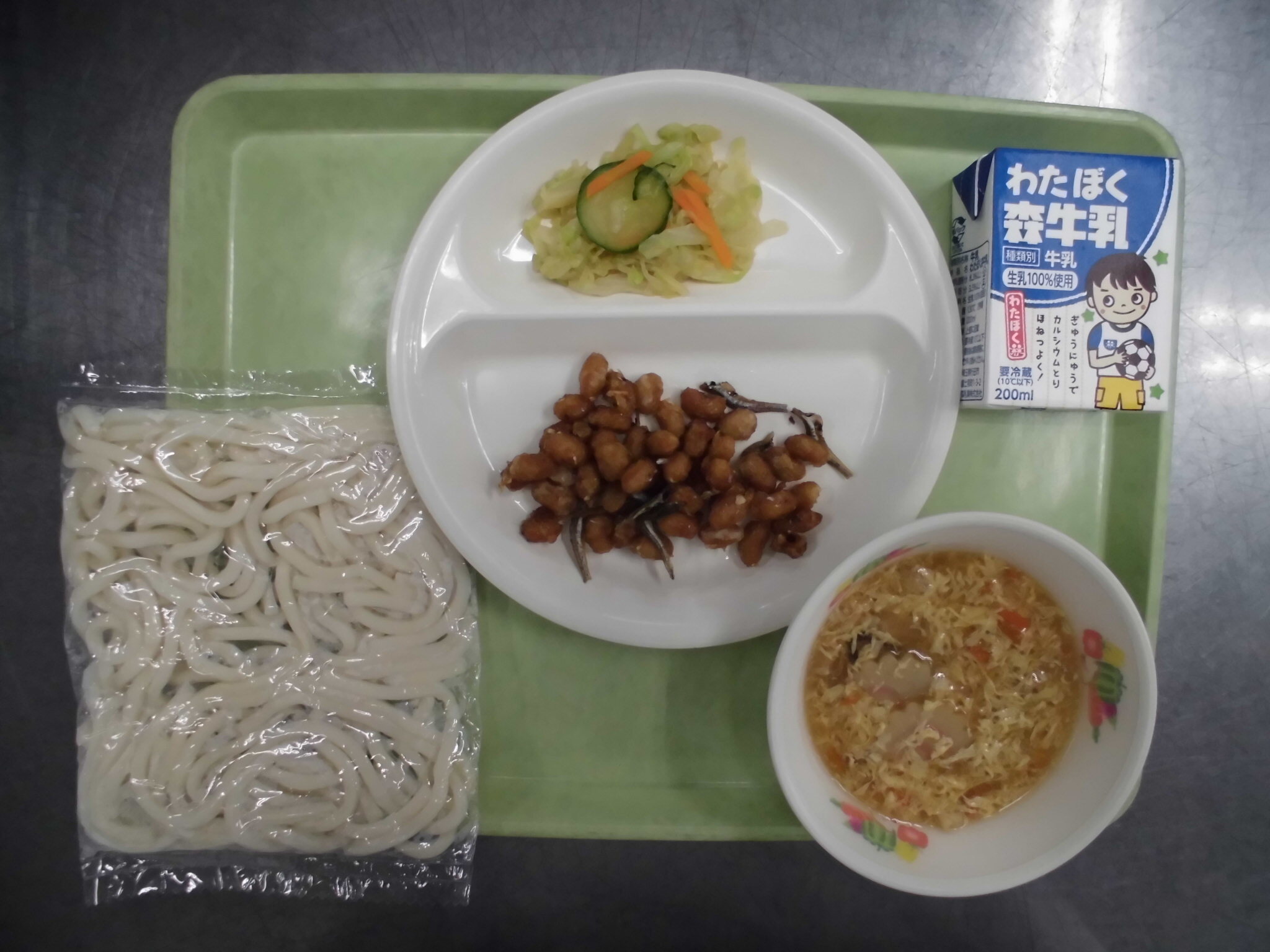 ごもくたまごとじうどん (じごなうどん) だいずとこざかなの しゃりしゃりあげ こびちゃあえ ぎゅうにゅう |