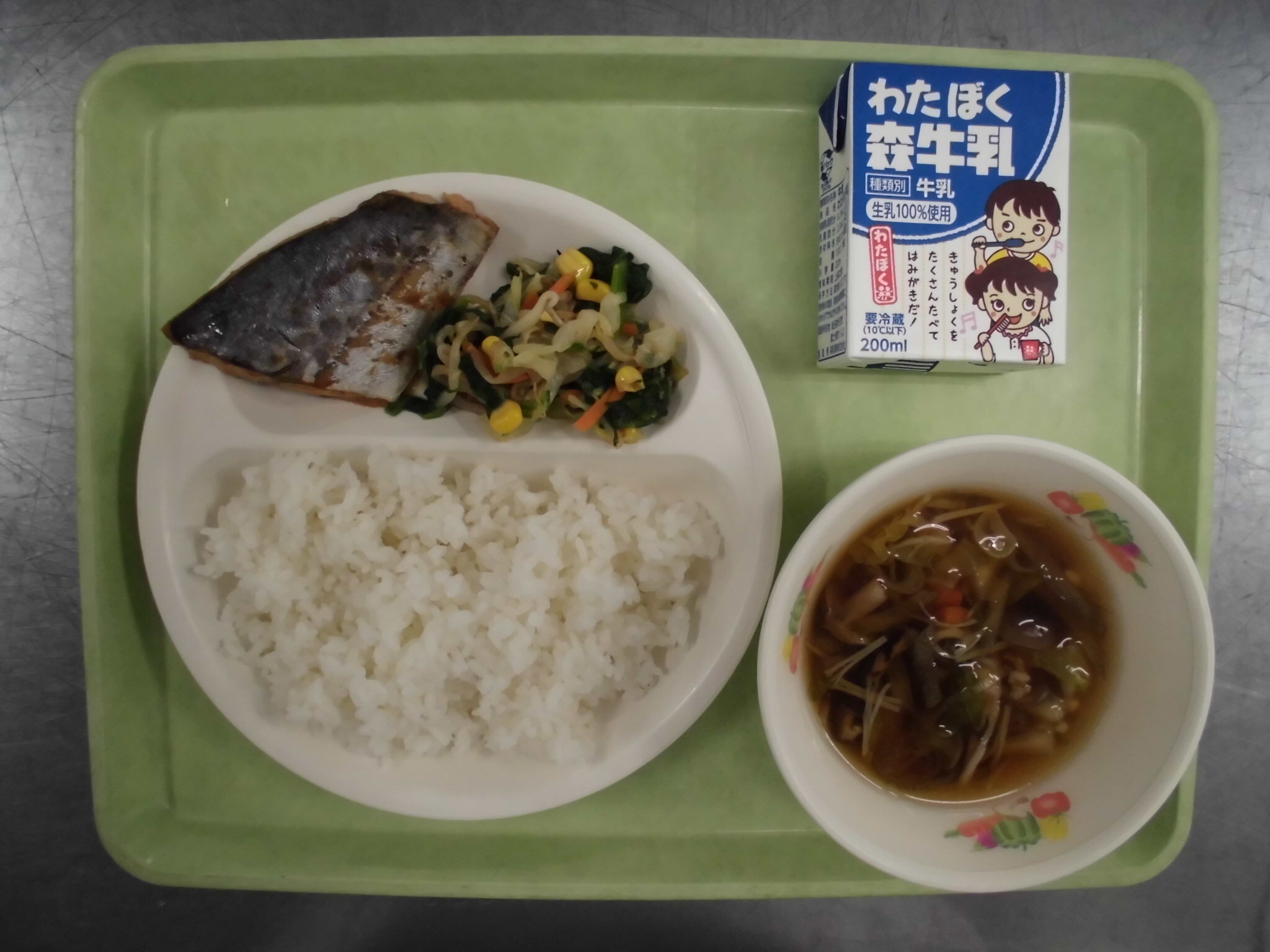 ごはん さわらのもみじやき ごしきあえ きのこじる ぎゅうにゅう |