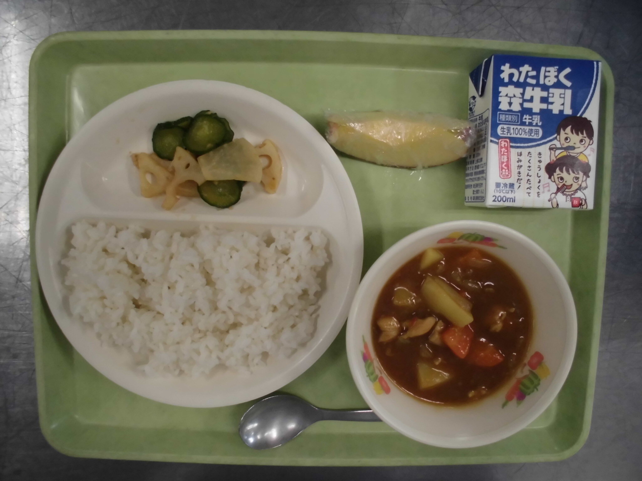 チキンカレー (ごはん) てづくりふくじんづけ りんご ぎゅうにゅう
