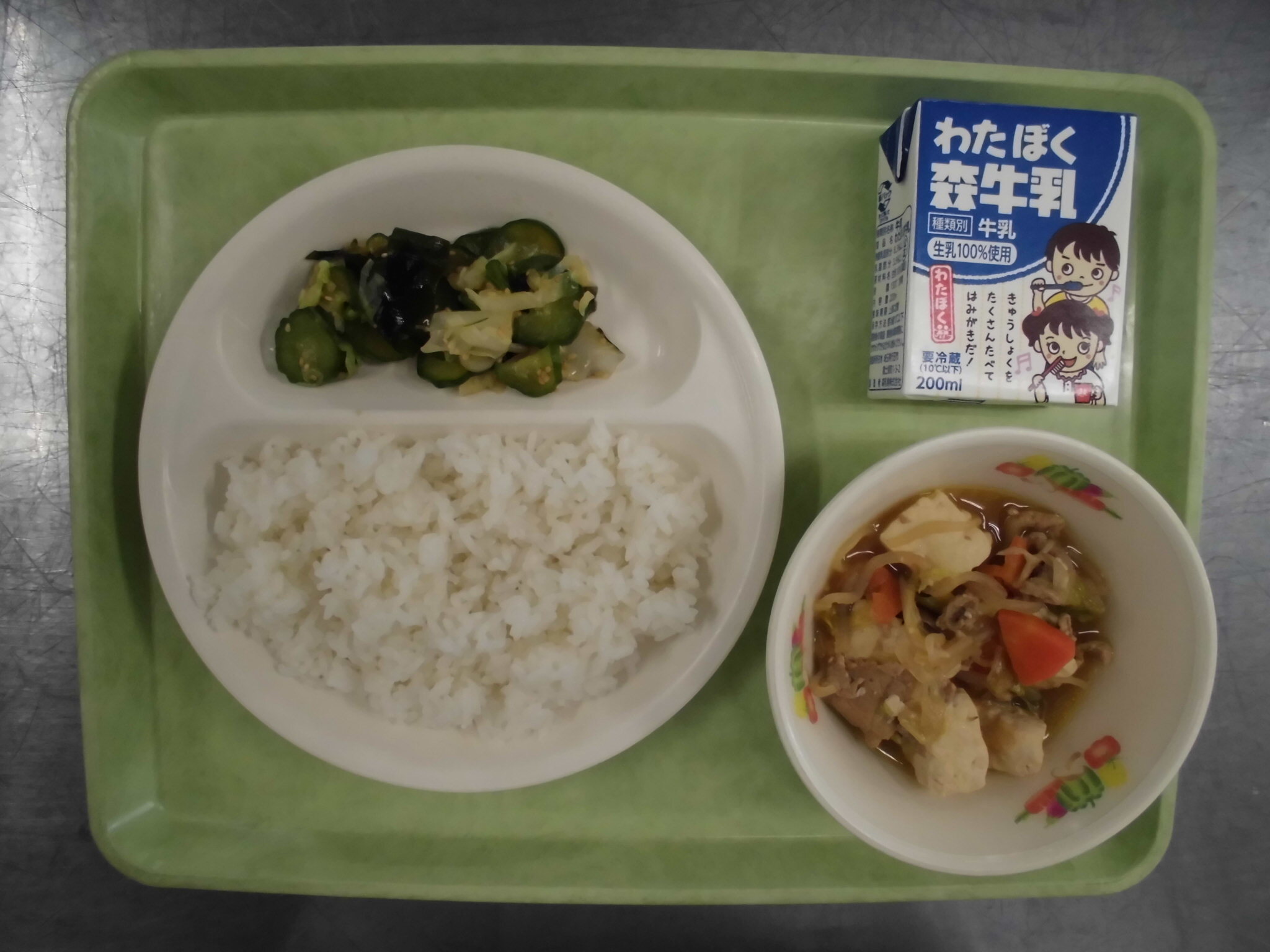 ごはん すきやきふうに きゅうりとわかめの すのもの ぎゅうにゅう |
