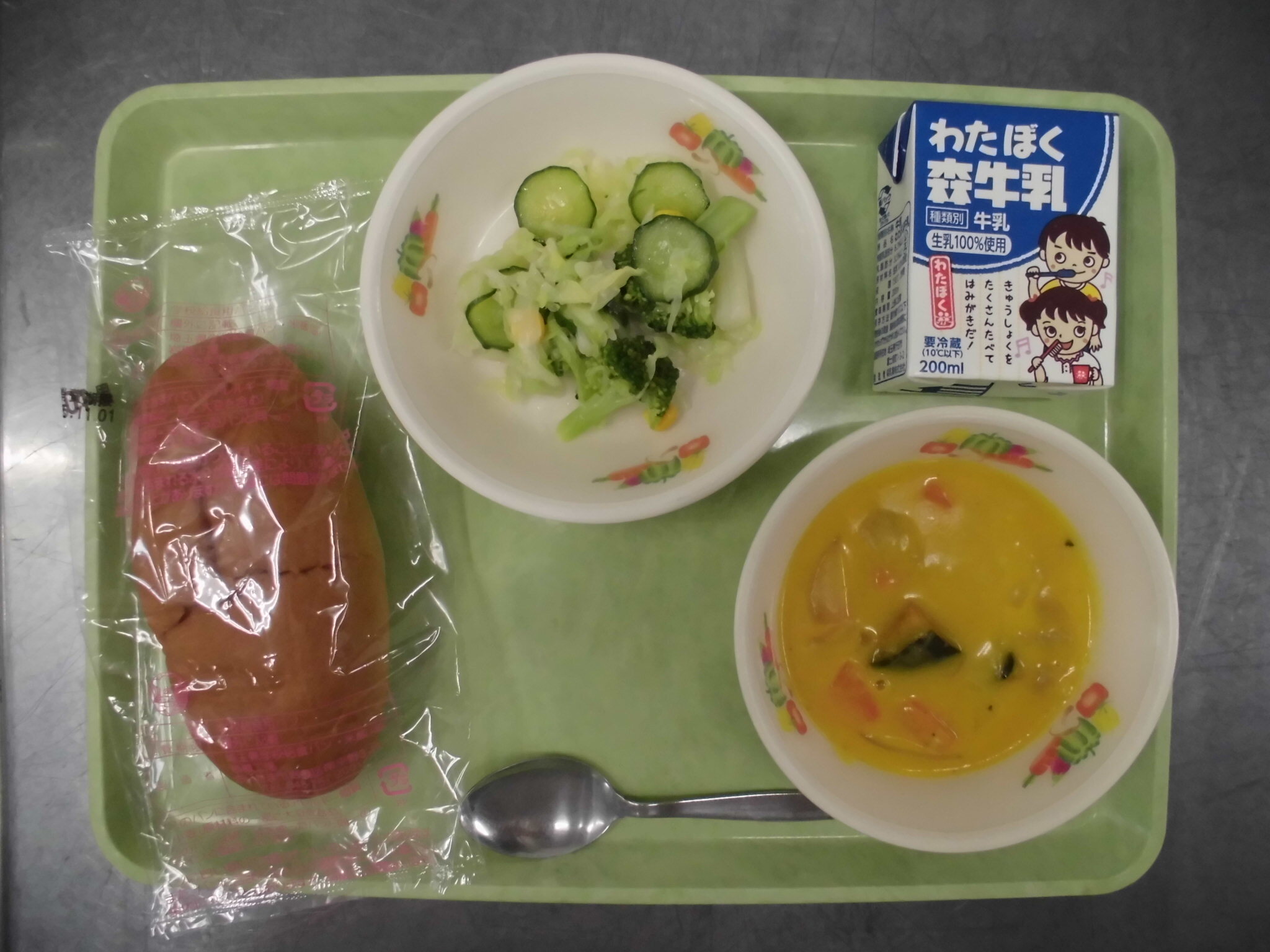 ハロウィンこんだて くろぱん パンプキンシチュー ブロッコリーサラダ