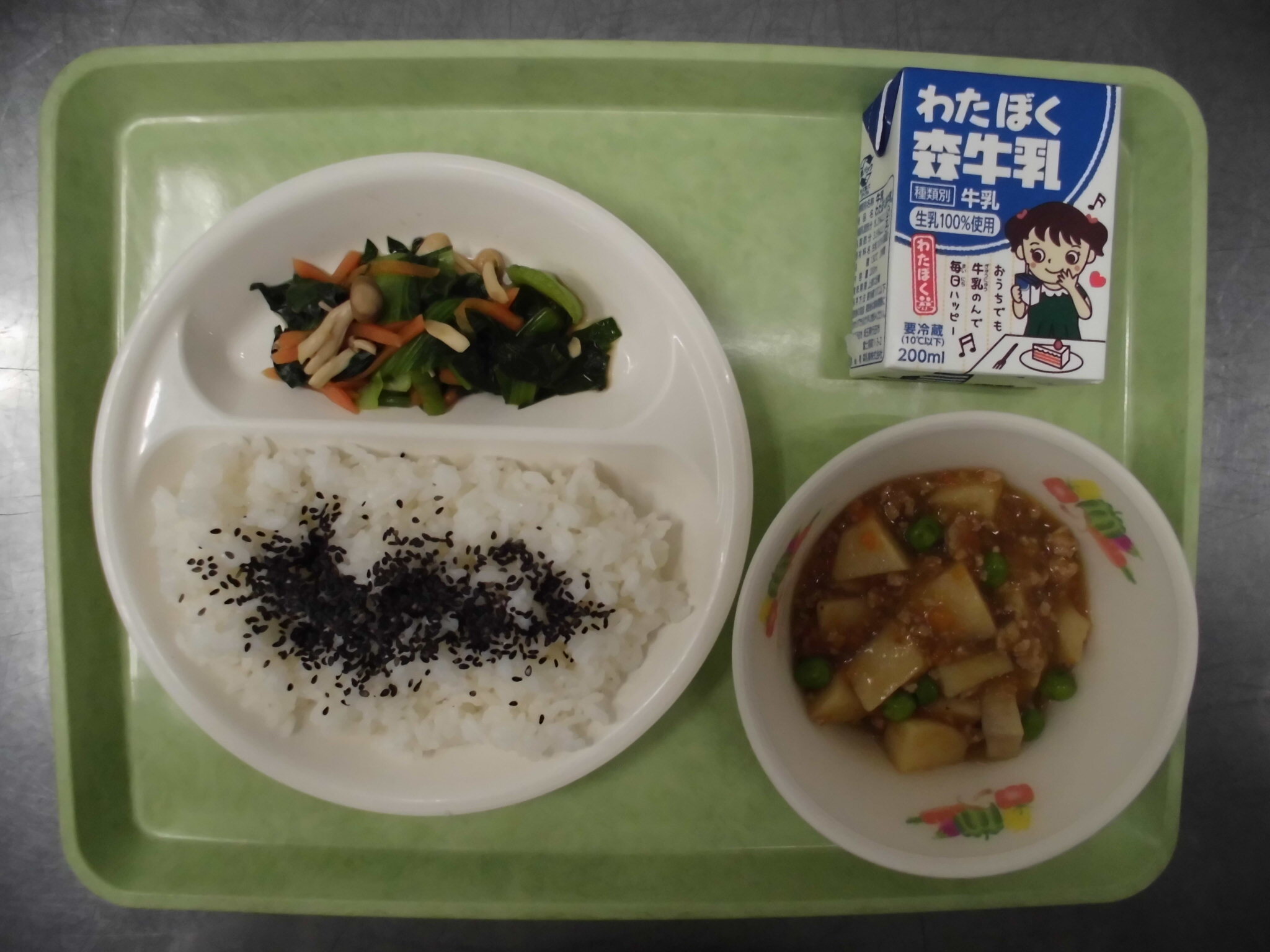 ごはん ごましお さといものそぼろに きのこいりおひたし ぎゅうにゅう |