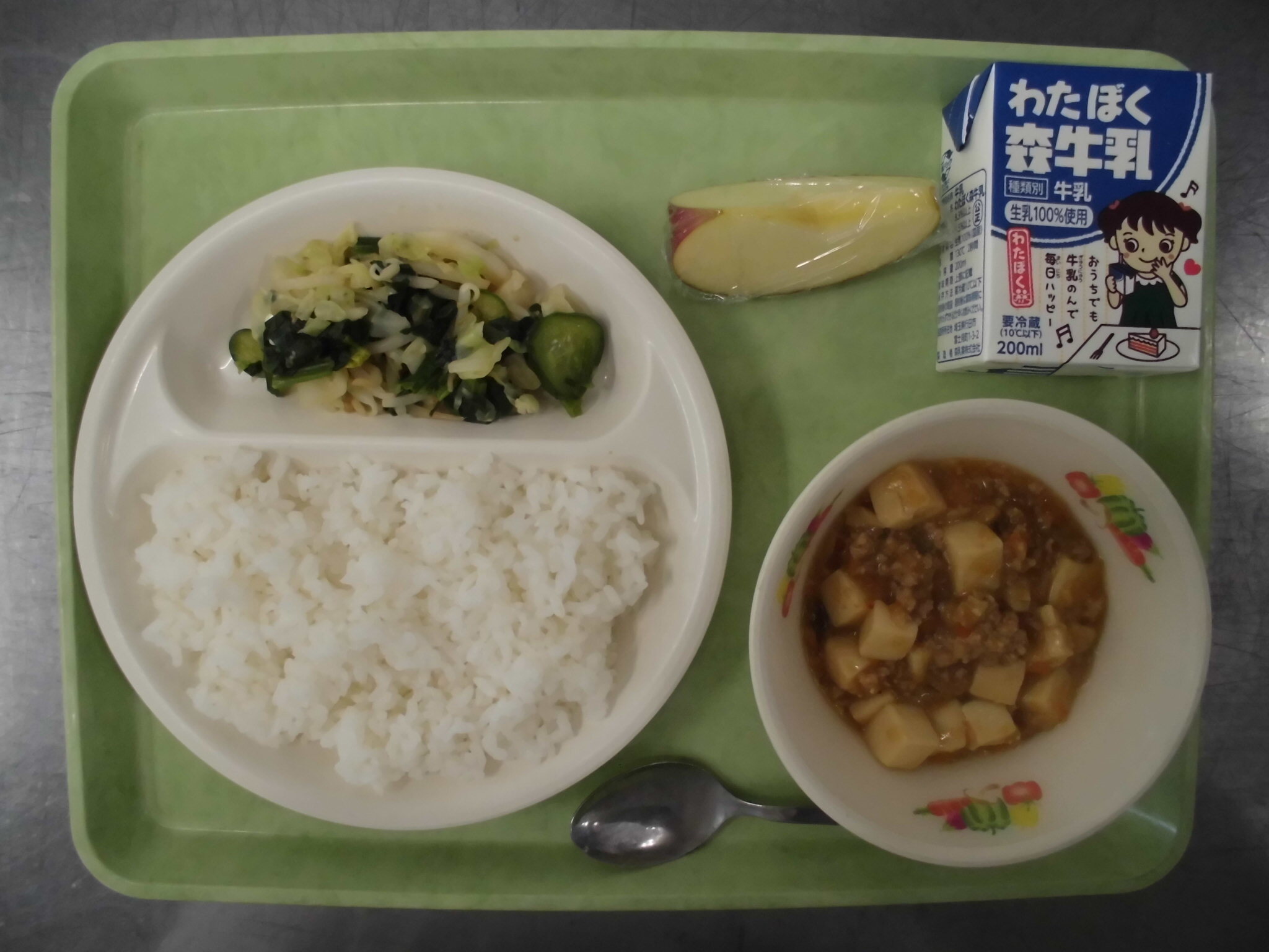 ごはん マーボーどうふ ちゅうかサラダ りんご ぎゅうにゅう |