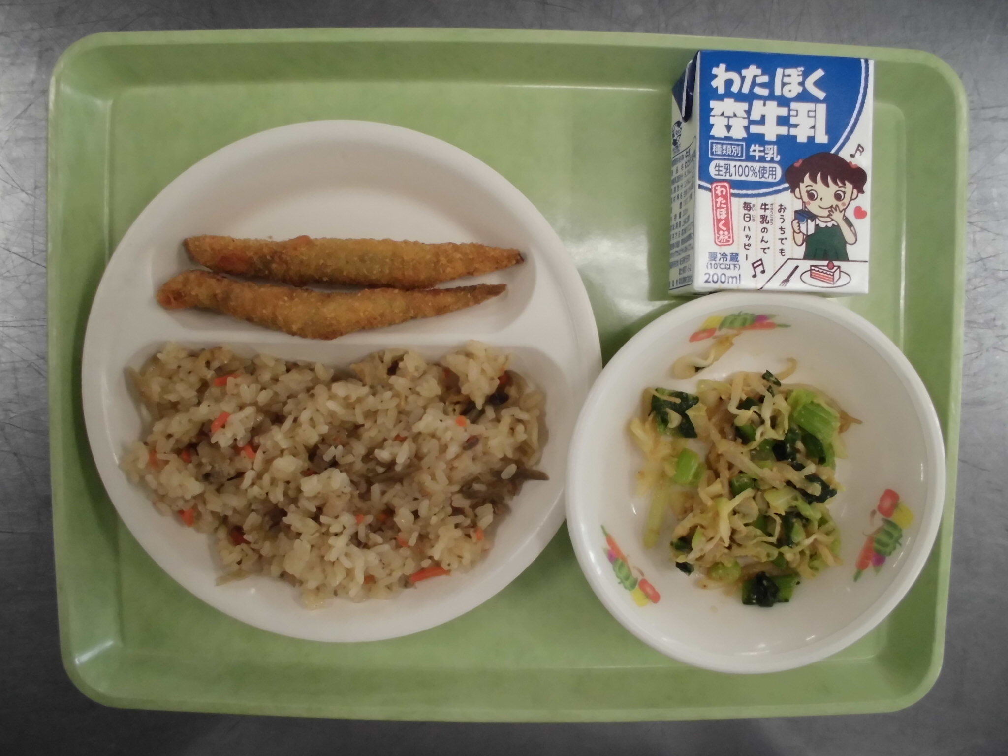ごぼうとぶたにくの まぜごはん ししゃもフライ ごまずあえ ぎゅうにゅう |