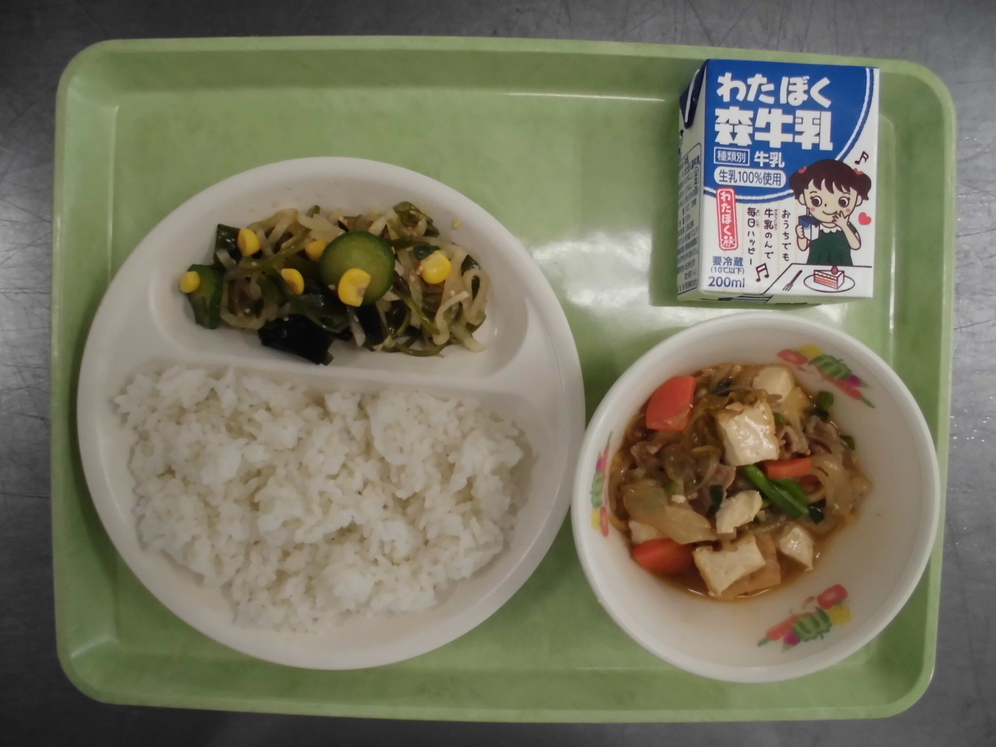ごはん なまあげとキムチのいために かいそうサラダ ぎゅうにゅう |