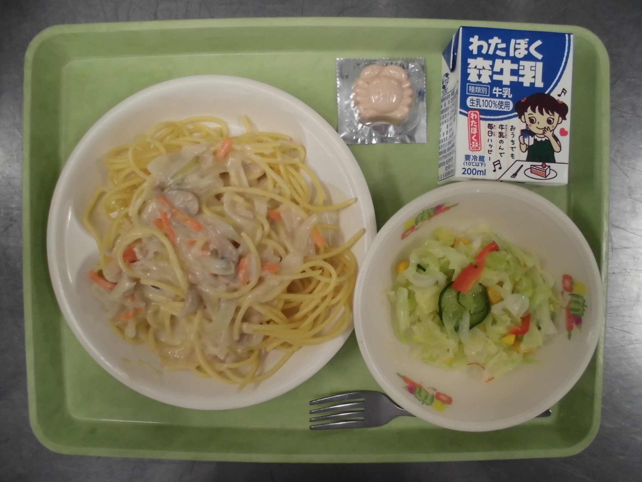 ツナときのこの クリームスパゲティ コールスローサラダ かたぬきレアチーズ (いちご) ぎゅうにゅう |