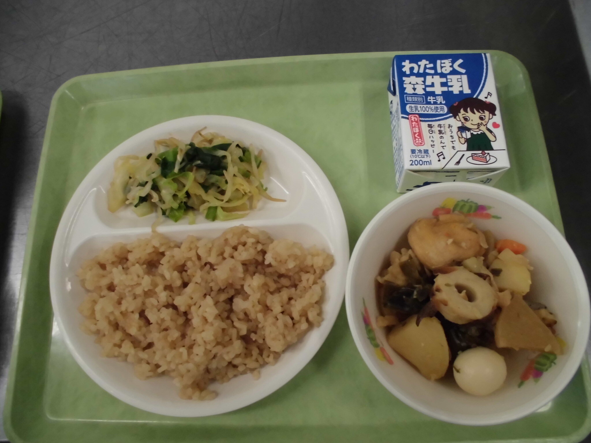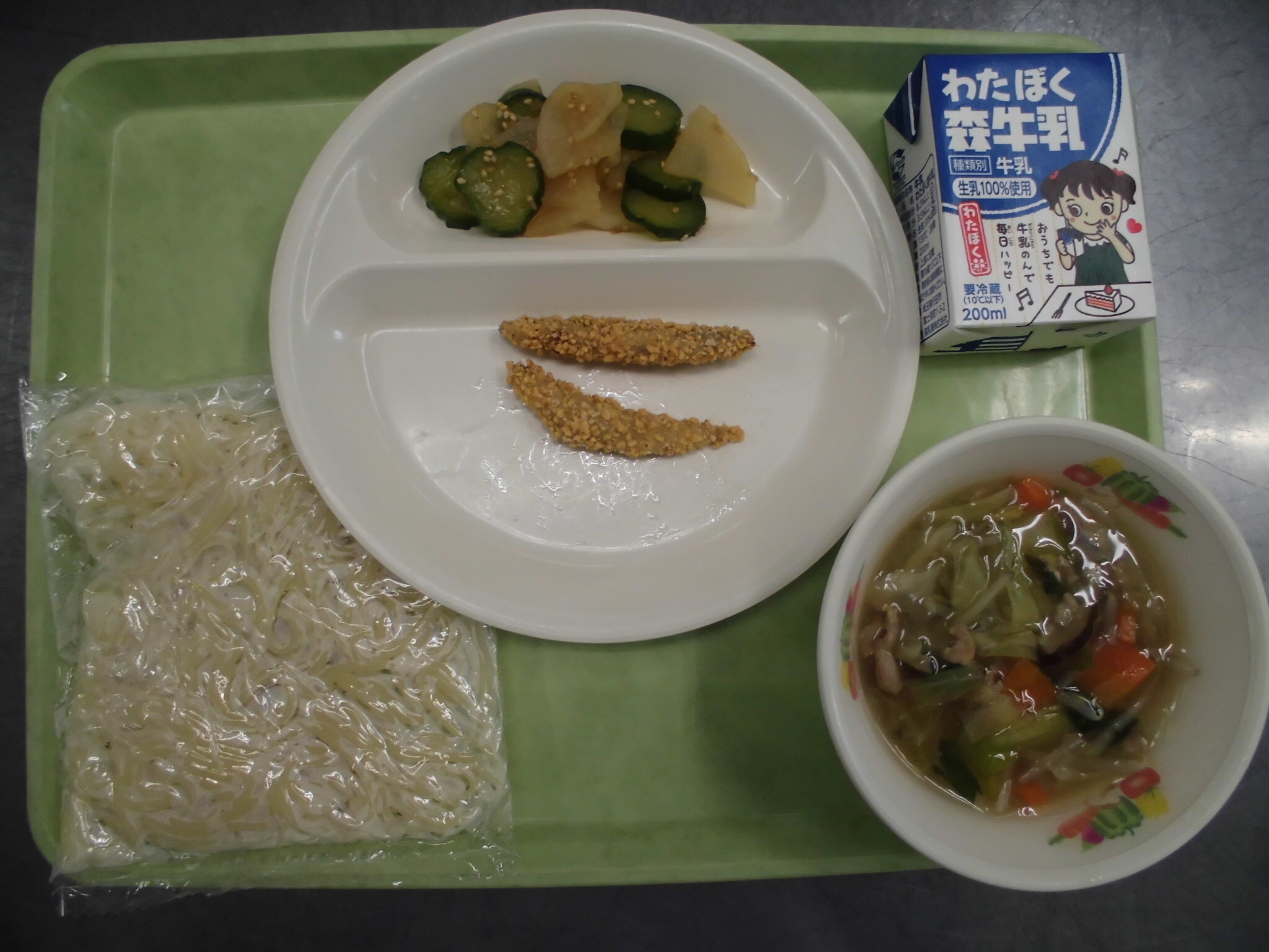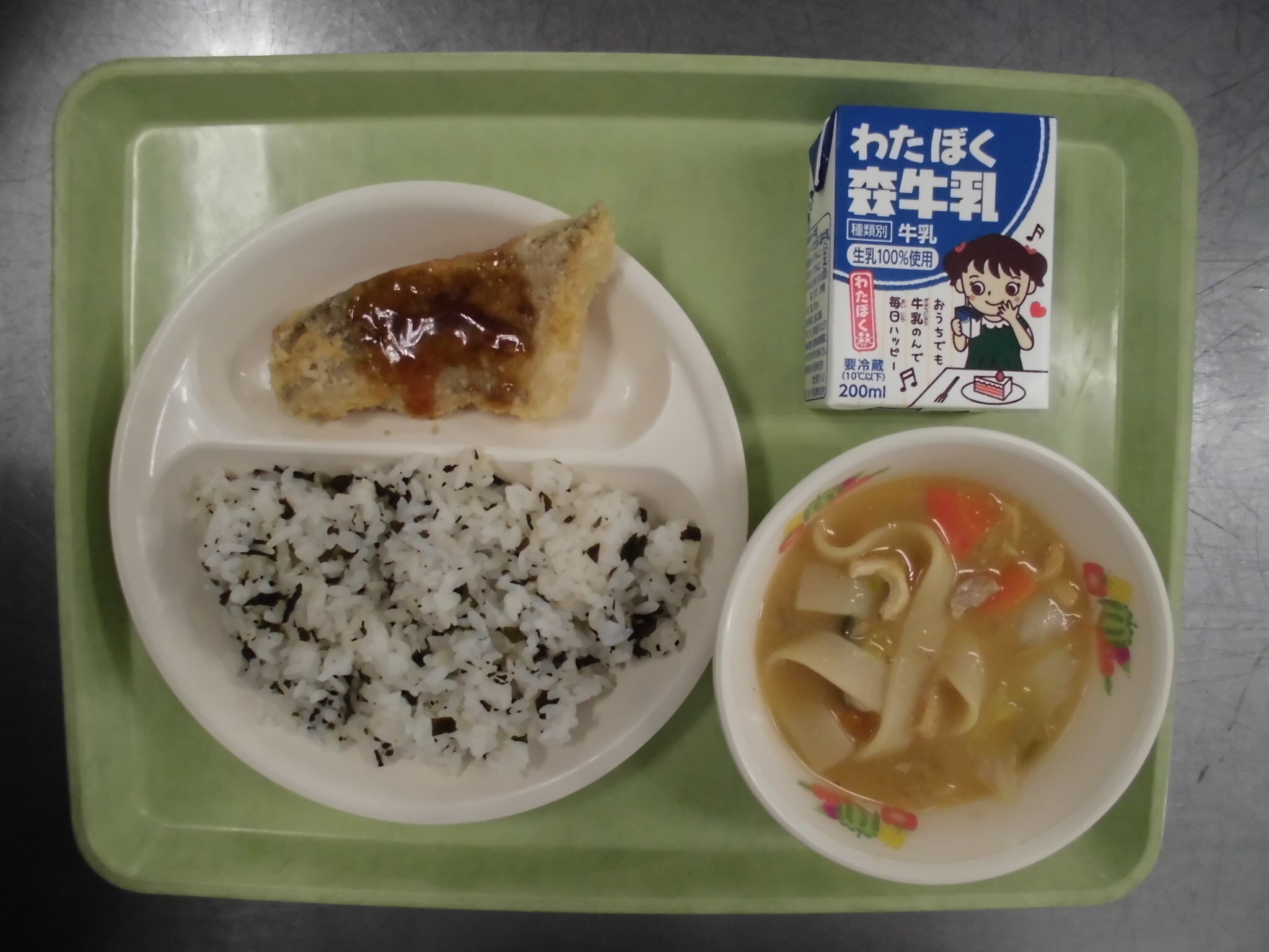 くわいごはん さばのたつたあげ ゆずかけあえ ぎゅうにゅう |